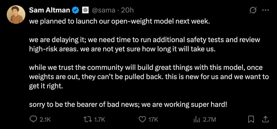 This delay comes amid growing public pressure for OpenAI to deliver on its promise of open-source AI development, literally living up to its name.